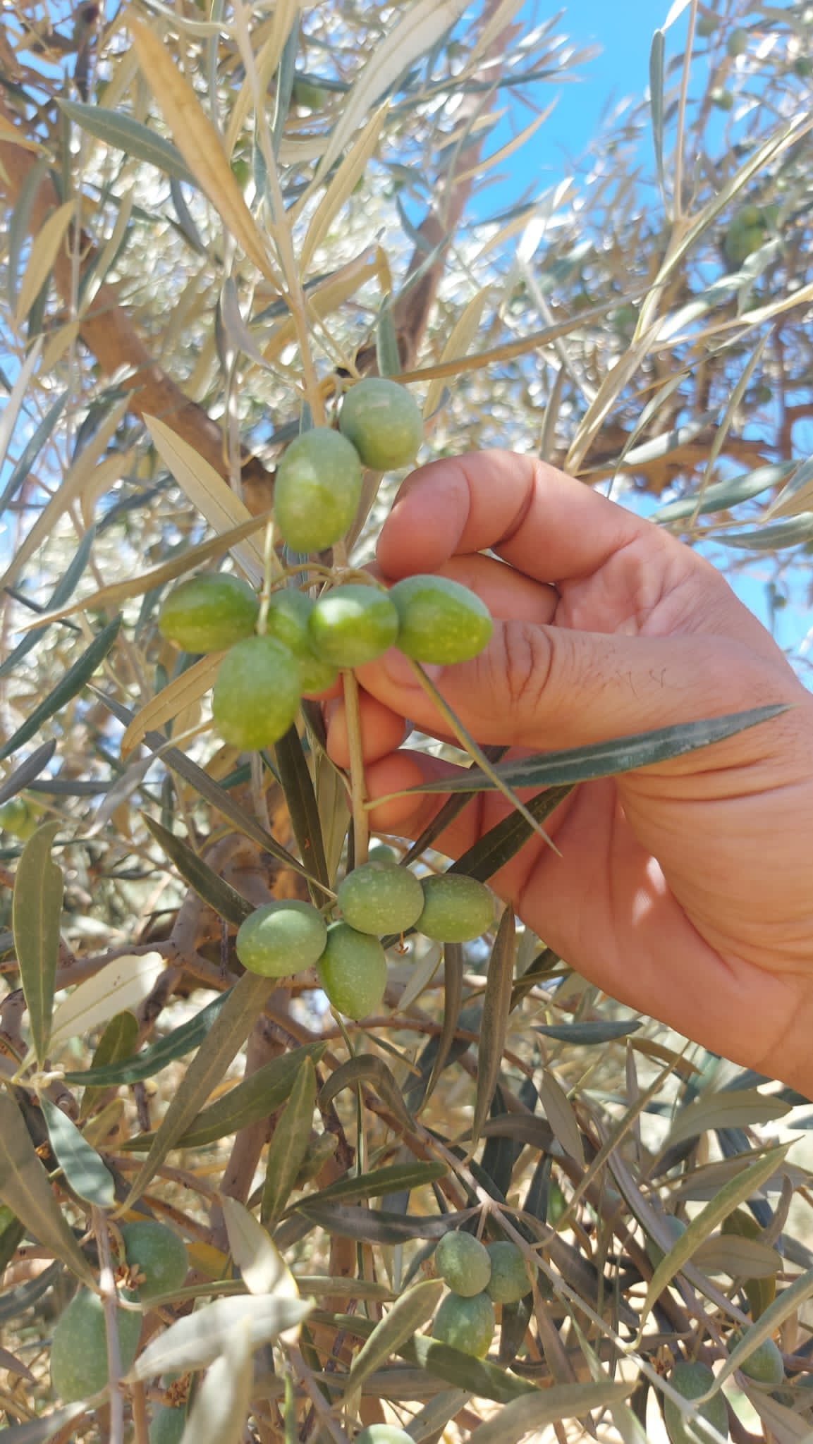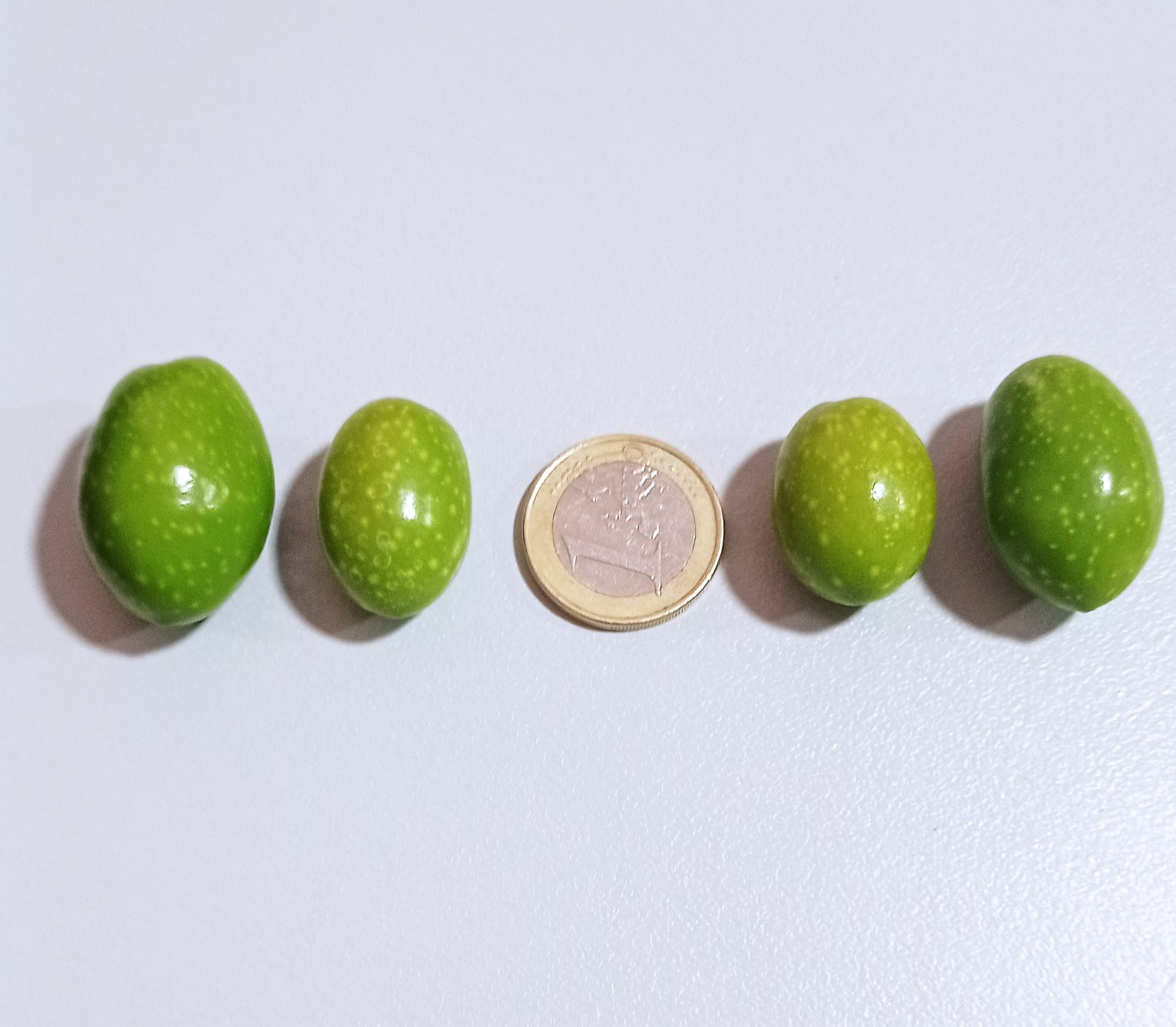 Tras realizar un tratamiento en primavera y repetirlo hace unas semanas, sus olivos presentan en la actualidad unas aceitunas relucientes, sanas, sin arrugar, verdes y con brillo. En la fotografía adjunta donde aparecen varias aceitunas en torno a una moneda se puede observar que las más cercanas al euro son las hojiblancas, ya que cuentan con un tamaño más pequeño, mientras que las más alejadas y grandes son las gordales.