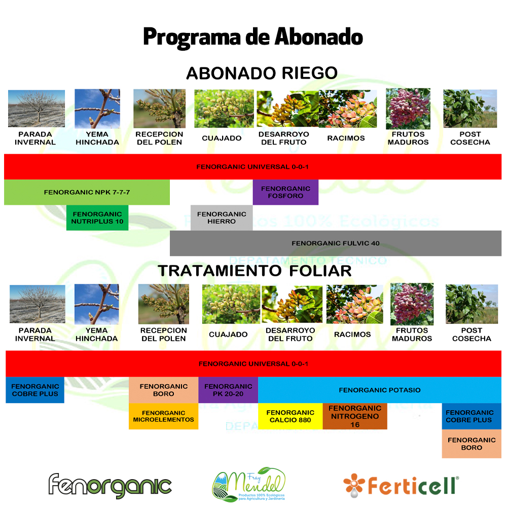 El cultivo del pistacho requiere una planificación nutricional precisa que responda a las necesidades específicas de cada etapa fenológica del árbol. En este artículo te presentamos el programa de abonado-por riego y foliar- recomendado por Fenorganic, una guía práctica y ecológica diseñada para optimizar el rendimiento y la calidad de la producción de pistacho desde el invierno hasta la postcosecha.